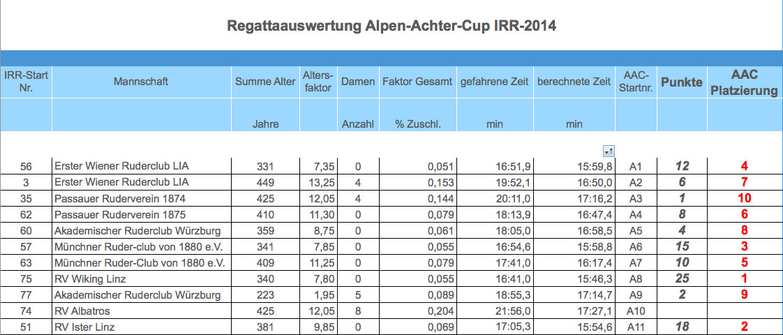 Hier die Platzierungen nach der 1. Regatta in Passau (korrigierte Version vom 22.04.2014):